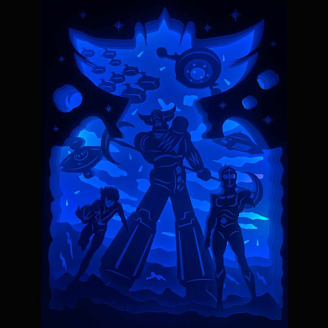 Plongez dans l’univers culte de Goldorak avec ce tableau lumineux en papier découpé, inspiré du célèbre robot géant et de ses combats intergalactiques.